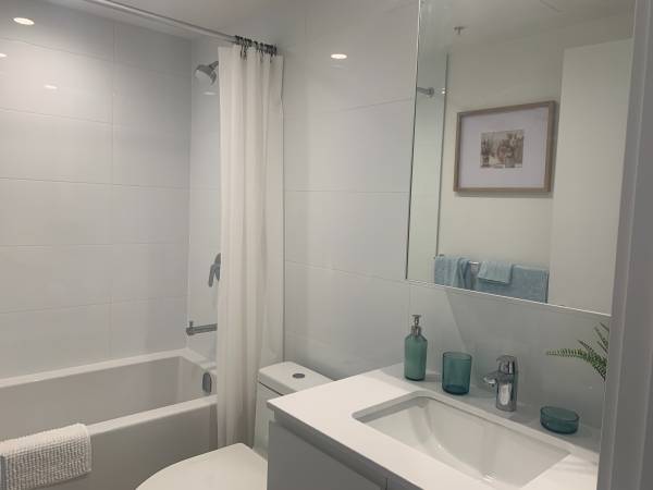 Newly Furnished 2-bedroom 2 Bathroom Condo in new Lougheed City highrise development by 3 Skytrain lines, bus loop, and shopping center. Balcony with upper views from the 27th floor. 2nd bedroom has a double bed (wall bed). The wallbed allows you to transition from bedroom to office at any time. Everything is provided for daily living.