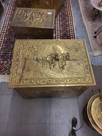 4 antique embossed brass fireplace coal, wood chest fire wood log boxes. Smallest one is $100.00, the other three are $175.00 each.