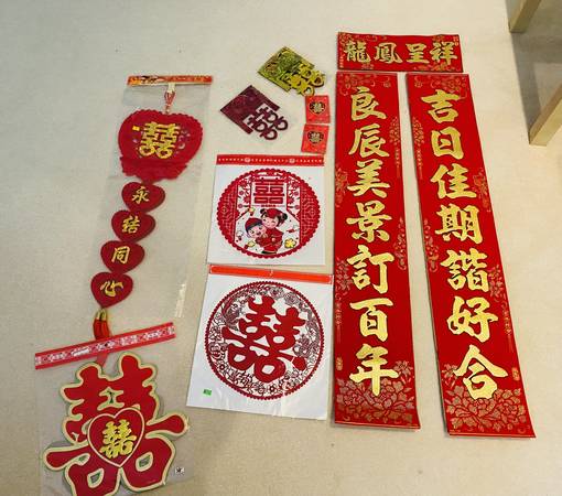 - 2 x wall decor 囍 with gold pop up in centre 2 x hanging red decor set (see photos)