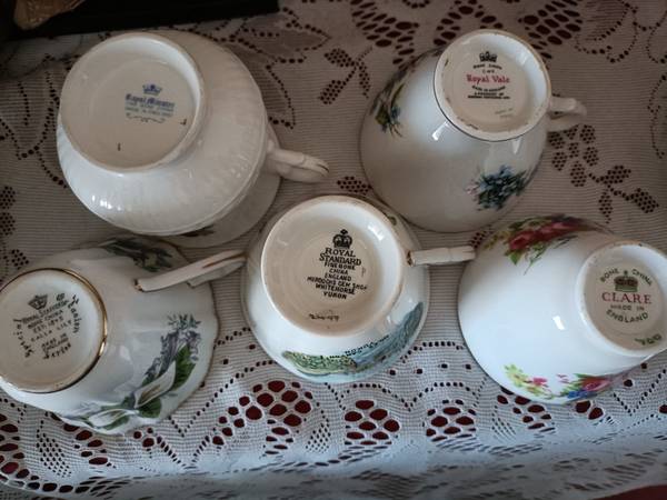 TAKE THEM ALL FOR $150 20 pairs of teacup and saucer brands including Royal Vale, Queen Anne, Royal Dover, Royal Minster, Clare, Royal Standard, Royal Lighten, Jason, Shaffordz Mikasa...etc made in...