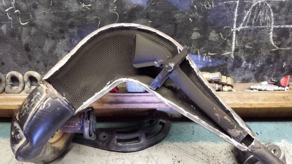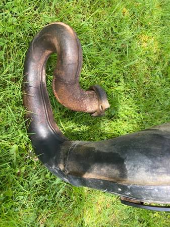 Expansion chamber fits 1984-1988 Yamaha DT200L. I was going to perform the de-restriction modification shown in the last photo, but I no longer have one of these bikes. The pipe has no major damage so use as-is or practice de-restricting on this one.