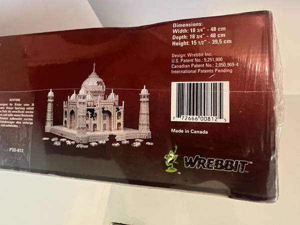 This Wrebbit 3D puzzle features the world famous Taj Mahal and would be a great challenge for avid puzzlers. Finished, it would make a colorful display item. Puzzle is unopened and box is in like new condition. Asking a very reasonable $10 and must pick up in South Burnaby. Enjoy the pictures and check Craigslist for other vintage items I have listed.