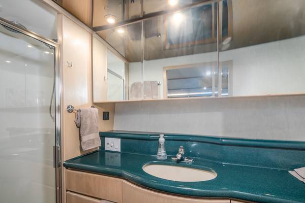 The huge full beam owners cabin is amidships aft with the ensuite head on the port side. This stateroom features a walk around queen bed, ample drawers, cupboards and a big cedar lined hanging locker for storage. The large ensuite has separate stall shower, vanity cabinet and electric toilet.