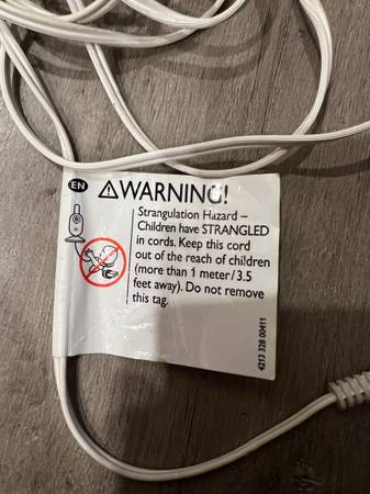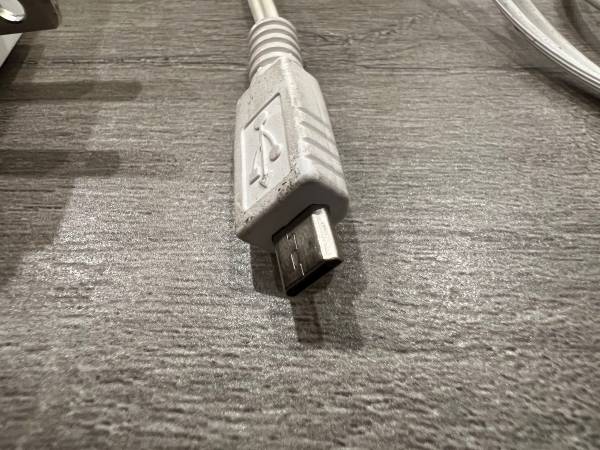 White Micro USB power supply - adapter with a long cord. Works for various devices, but not sure where it’s from. Moving and can’t match any device we have .