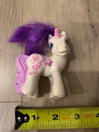 Vintage My Little Pony collectible figure. White pony, purple hair and tail. Small hearts and swirls design. Pre-owned.