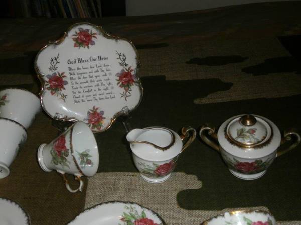 Multi-piece tea set from Japan from the 1950's. Over 60 years old. Vintage hand-decorated, rose pattern with gold rims. In very good condition except of the comment below.