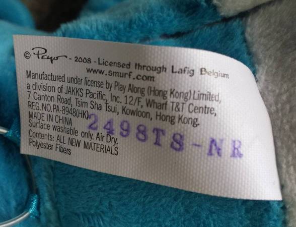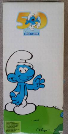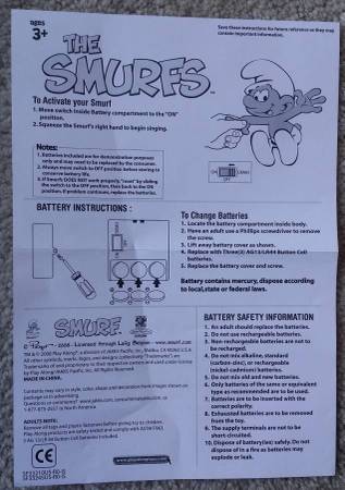 Item was removed from sealed box to replace batteries to confirm working condition. On pressing the switch in the right palm a portion of the Smurf theme song plays. Smurf has been replaced and secured in the original packaging. Smurf is in NEW condition.