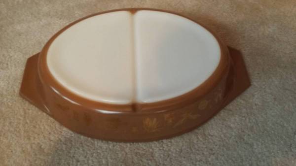 Vintage Pyrex Early American/Canadian Brown & Gold 1 1/2 QT (OCVD12) Oval Divided Dish and 2 1/2 QT (#475-B) Round Casserole with Pyrex Lids