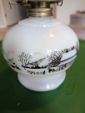 Vintage Oil Lamp, milk glass vase, glass funnel shade. Working order, great for back up lighting or camping. Measures 15" tall. Good condition $20