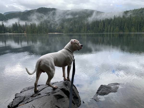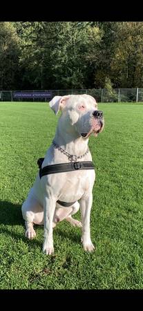 Handsome stud ready for a willing female. Ice is a 2 year old Dogo Argentino cross American Bulldog Bully. He is a healthy blue eyed boy with a sweet loving demeanour. Fed raw and excersized daily. He is all white with black nose and unique blue eyes. Very handsome and strong. Message me for a potential match. Ask for details