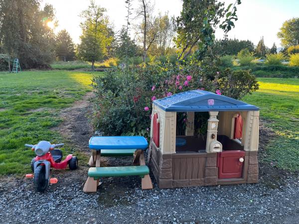 Playhouse for the littles. In good condition. $45 Local delivery available. Take all 4 items shown in the pictures for $100. Hours of fun! Picnic, basketball, step 2, tykes, house, play