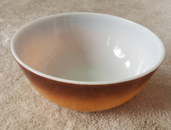 Vtg #404 Pyrex Old Orchard 4 Qt Large Mixing Bowl VGUC Brown Butterscotch 2 Tone Fade Has shine and is nice vintage condition overall. Some marks, see last Pic Made in U.S.A. Oven Ware 4 Quart...
