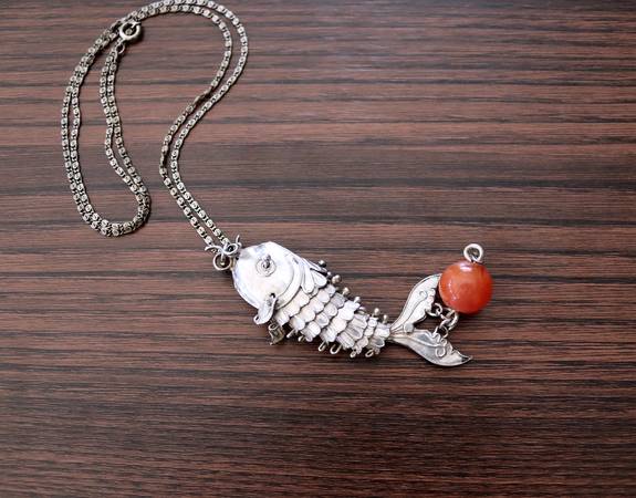 A late 19C/early 20C Chinese silver reticulated fish pendant with imitation agate/carnelian glass bead in the form of a pomegranate. The chain is folded in a unique key-lock pattern.