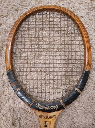 A classic wooden tennis racquet by MacGregor. Racquet is a little beat up but the strings are tight. Perfectly playable. Join the sport for cheap with a vintage look. Can include some balls.