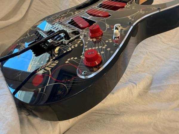 I’ve got one very minty Ibanez Jem FP2 with EMG David Gilmore pickups installed. I also will include the factory pickups new in the box if you prefer those. I purchase this brand new and it was never gigged or used live. Just spent most of its time in a climate controlled space. It was also signed by SteveVai but the signature has faded. I do have a picture of Steve signing it somewhere.
