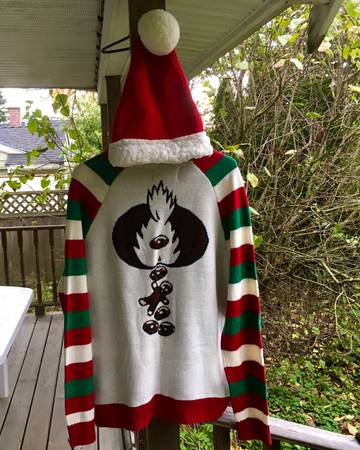 Like New Cute Ugly Reindeer Pooping Gingerbread Sweater Size Large (60% Acrylic 40% Cotton) with Reindeer Toque Hat (100% Acrylic) Nicely finished inside the sweater, no hanging threads. Lay Flat measurements on front side of sweater only 28”L x 22”W Toque or Hat lay flat front side only 15”L x 10”W stretches can fit a man’s head. Both for $35.00 Cash Only, No Deliveries. Non-smoking, no pets household. Downsized.