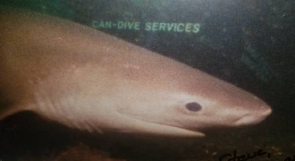 can-dive services, vancouver diving history, shark underwater photo, scuba diving collectible, british columbia marine memorabilia, framed shark art, gamma industries frame