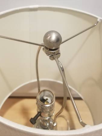 Stylish and elegant table lamp with a stacked double-glass ball base and chrome accents. Comes with a clean white fabric drum shade. Perfect for a nightstand, side table, office desk, or living room décor.