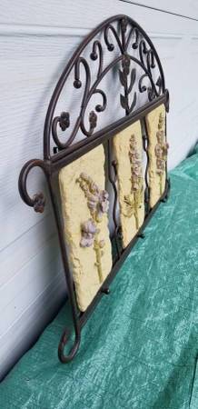 REDUCED to Only $39 Today! Large Decorative SHOW HOME Wrought Iron & Stone Wall Mount with Coat Rack Pegs NOTE: Very Heave Quality Item with One Panel that has a Repair but Shows Really Well!...
