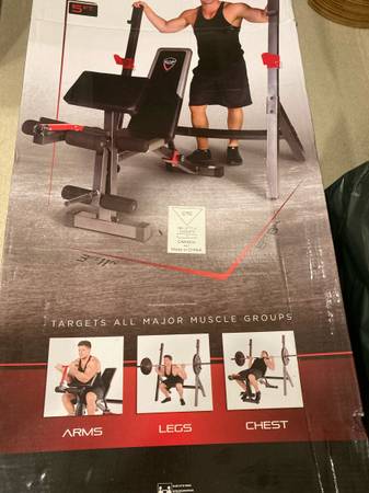 Bench and rack set. Rack never assembled, still in box. Bench assembled.