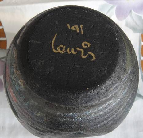 1. This could be your candy jar - a beautifully shaped and glazed pot, pinched style, signed with "Lewis, 1991". 18cm (7inch) is the largest (middle) diameter, and the height, too. Great condition, like new.