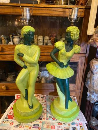 Two corresponding male / female chalkware lamps. Vintage 1950s featuring a dancer and musician. Both lamps work. Lovely accents for you Mid Century Modern home.