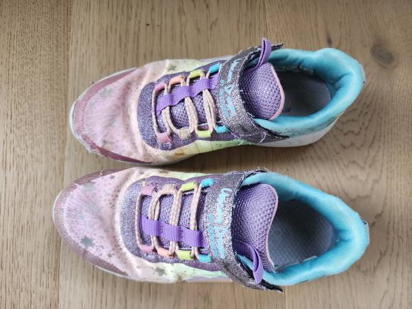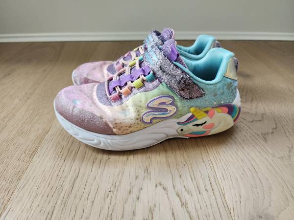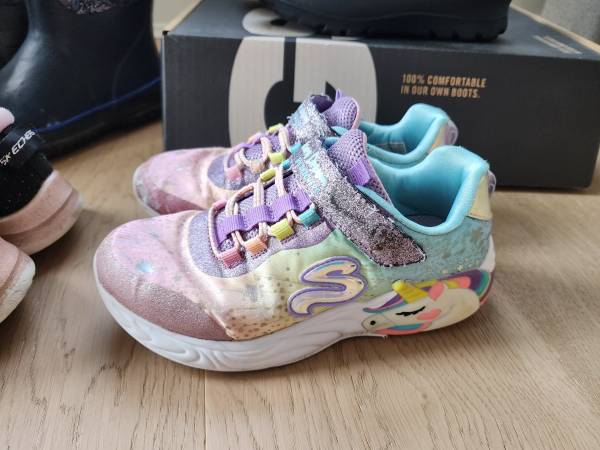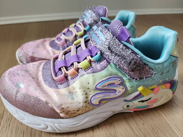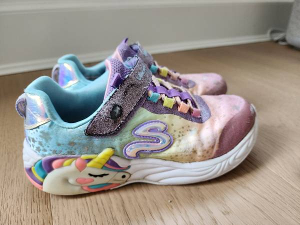 3. Skechers size 1 with unicorns on side. These are in used condition with wear on the straps and front toe of the right shoe as seen in the photos. But still life left! One shoe still lights up by the unicorn but the other one doesn't. $8