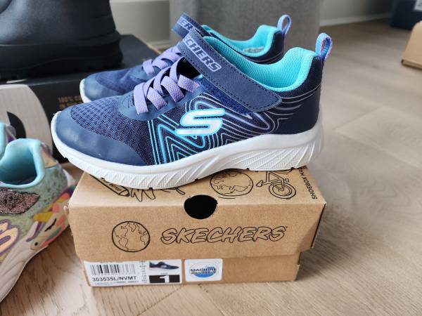 4. Skechers size 1 navy/aqua shoes. Only worn indoors at school - look almost new still! $25