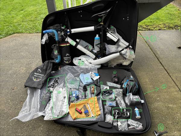 The frame, wheels, and main components are currently packed securely in a professional bike case, ready for transport.