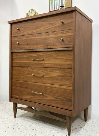 Exquisite mid century walnut tallboy dresser in excellent fully refinished condition. This dresser is well built with solid wood construction. Features four spacious dovetail jointed drawers that epitomize fine craftsmanship and original brass drawer pulls refining the design. Drawers are dovetail jointed, and open and close smoothly. Second drawer from the bottom up is a large drawer that was made to look like two drawers on the outside. All exterior surfaces from top to bottom were stripped, sanded, and sealed with multiple coats of Danish oil. Very minimal signs of wear remain due to age and use. There is also matching lowboy dresser available. Dimensions: W32" x D18" x H43 1/4". Delivery available for a fair fee. Swipe to see more pictures and contact info.