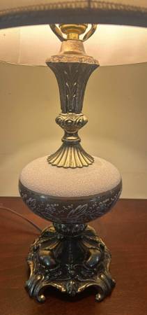 Add timeless charm to your home with this stunning vintage table lamp. Featuring a beautifully crafted ornate base with intricate detailing, this piece is the perfect blend of sophistication and functionality. The elegant off-white lampshade complements the antique-style base, providing a warm and inviting glow.