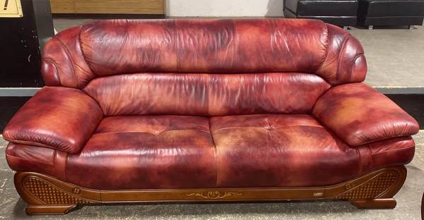 Stunning Demona leather 3-piece set upholstered in rich burgundy / oxblood genuine leather with an elegant hand-carved solid wood base. Deep, plush seating and heavyweight constructionβthis is a high-end set built for comfort and longevity. A true statement set rarely found on the resale market.