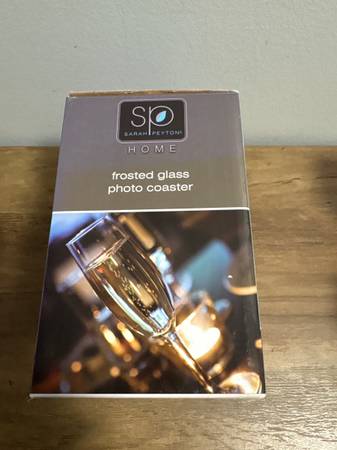 Set of four frosted glass coasters. 2" x 3" photo inserts. Black holder included. New in box.