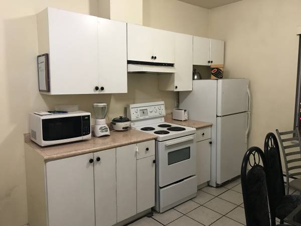 Room is on the second floor , has window . The kitchen has stove ,fridge, microwave ,kettle ...