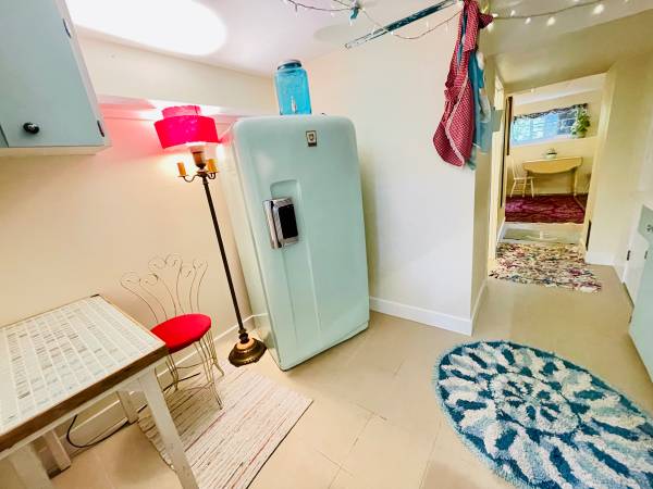- Furniture includes bed, couch, desks, a very cute kitchen dining nook with an authentic 1940’s vintage fridge and freezer